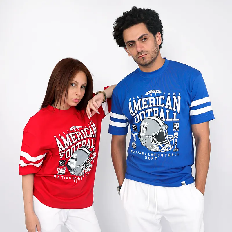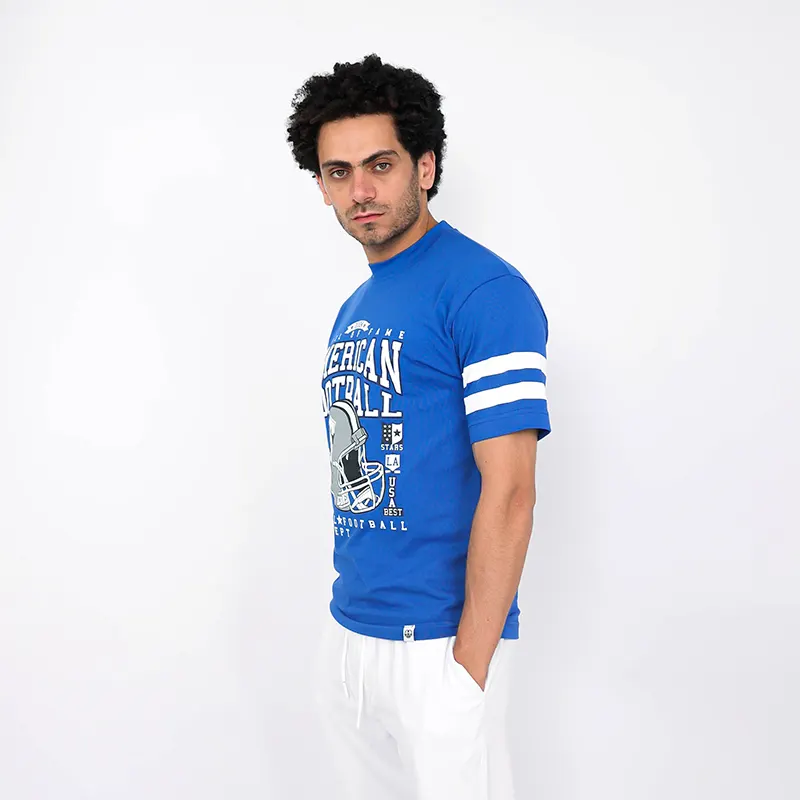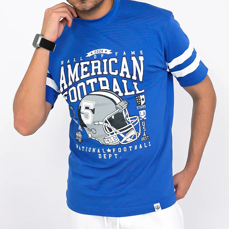 تضفي طبعة كرة القدم الأمريكية المميزة لمسة رياضية على الخلفية الزرقاء، مما يجعل هذا التيشيرت مثاليًا لعشاق كرة القدم والملابس الكاجوال على حد سواء. تصميم واسع لسهولة الحركة