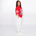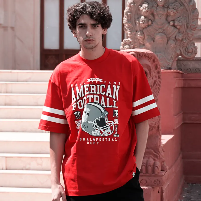 صُنع تي شيرت كرة القدم الأمريكية (الأوفر سايز) الأحمر من 100% قطن جيرسيه ثقيل، وهو مصمم ليدوم طويلًا ويوفر تهوية ممتازة.